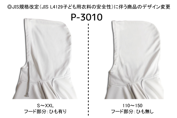 子ども用衣料の安全性に伴い子どもサイズにはフードのひもはありません。